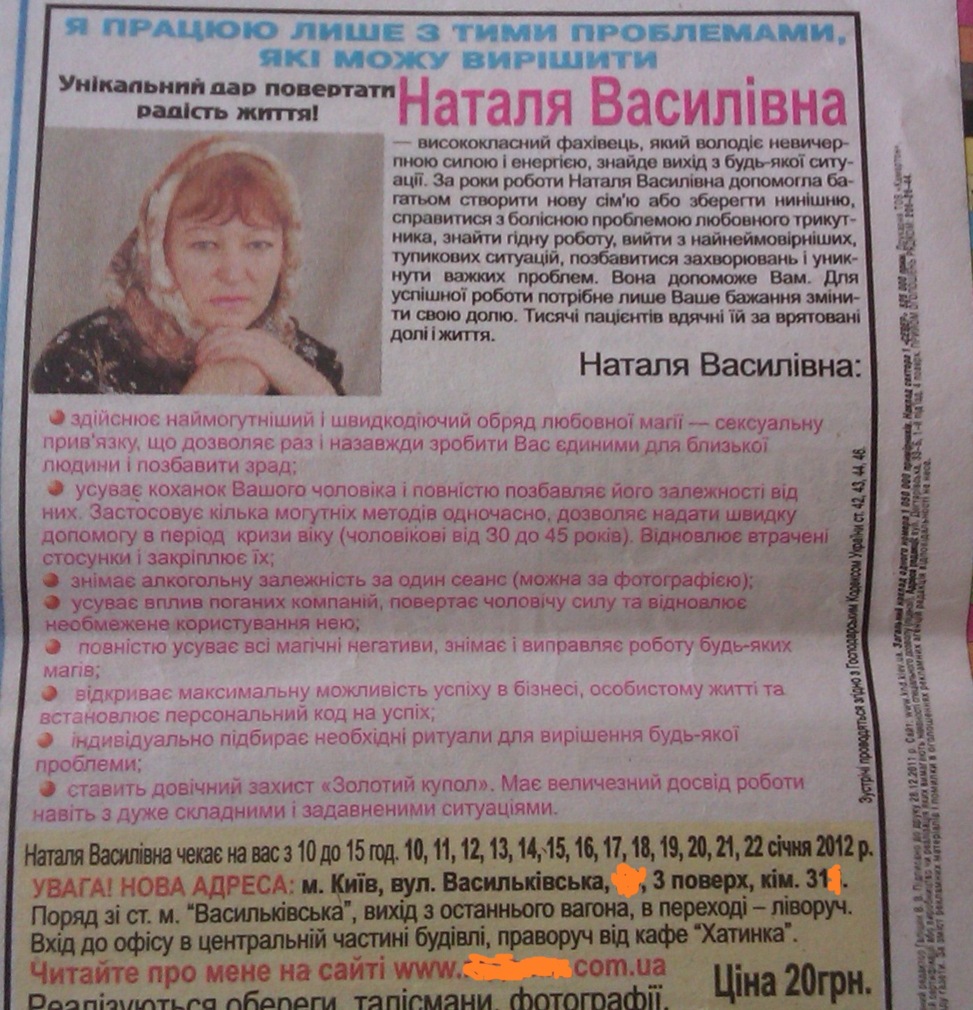 В «Киеве на ладонях» такие объявления зачастую встречаются в разделе «Услуги». Действительно, услуги здесь на любой вкус: внимательный читатель находит информацию о том, как наследственная предсказательница ставит защиту от всех уровней сглаза, ясновидящая и «спасительница» снимет порчу и родовое проклятие, и как «высококлассный профессионал, владеющий неисчерпаемой силой и энергией, найдет выход из любой (!) ситуации». А некоторые прорицатели скромно не называют свое имя, сэкономив рекламную прощадь на заглавную фразу большими буквами «ПРИВОРОЖУ!!!».