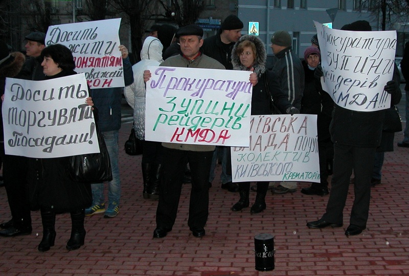 14-15 февраля 2013 г. коллектив Киевского крематория пикетировал прокуратуру г. Киева с требованием остановить отдельных руководителей Киевской городской госадминистрации, которые «по понятиям», пренебрегая законами Украины, осуществляют рейдерский захват предприятия.