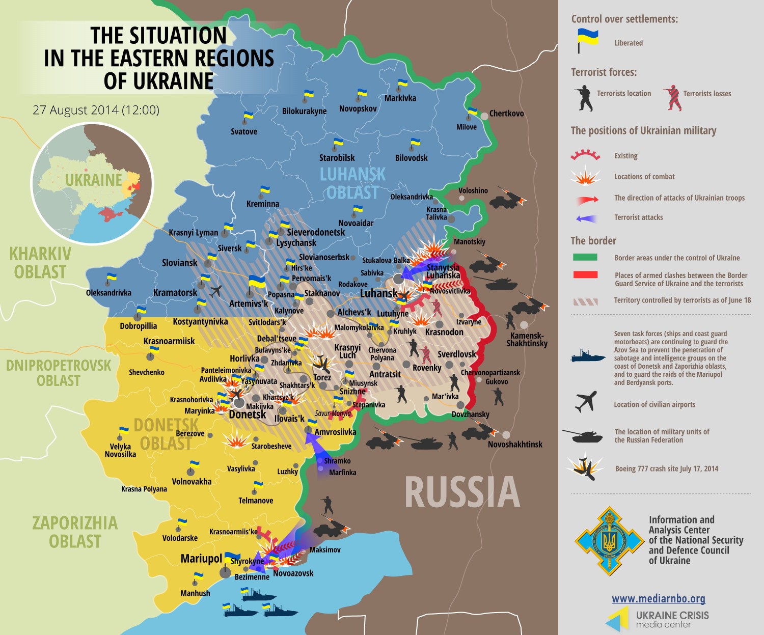«Террористы попытались атаковать блокпост сил АТО вблизи поселка Адрианапиль Донецкой области. Нападение отражено, восторженно 8 боевиков и стрелковое оружие. По результатам огневых ударов украинского артиллерии по скоплению террористов неподалеку населенных пунктов Горловка и Иловайск, уничтожено три танка, одну боевую бронированную машину, две системы «Град», четыре миномета, один автомобиль и одну установку «Смерч». Это система залпового огня калибра 300 мм, что вооруженная запрещенными кассетными боеприпасами, об использовании которых мы неоднократно сообщали. Также уничтожено около двухсот террористов. В ответ на нападение на наши позиции неподалеку населенного пункта Красный Яр огнем артиллерии уничтожено один минометный расчет вместе с минометом», - сообщил пресс-секретарь СНБО во время брифинга.