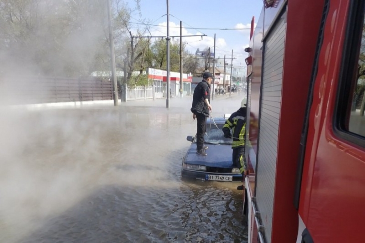 Отмечается, что 17 апреля на номер "112" поступило сообщение о том, что на ул. Матюшенко произошел прорыв трубы с горячей водой. Водитель и пассажир наполовину затопленной Мазды перелезли на крышу автомобиля и нуждались в помощи.