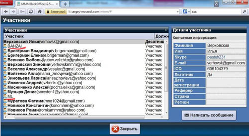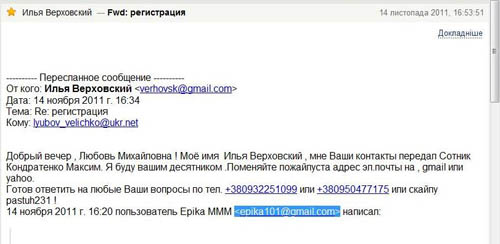 Позвонив по указанному на сайте телефоне с просьбой зарегистрироваться в МММ, Максим попросил выслать на его электронный адрес наши ФИО, телефонный номер и е-mail, что мы и сделали. О том, что система работает слажено стало ясно, когда к нам уже через 15 минут пришло письмо от некого Ильи Верховского. Он сообщил, что отныне будет нашим десятником. То есть, его реферер Максим Кондатенко как начальник, отдал подчиненному новичка.