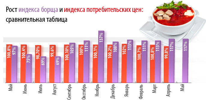 *За основу эконом-варианта борща (из расчета на троих членов семьи) берутся такие продукты, как картофель (400 г – 20,2 грн./кг), свекла (300 г – 4,6 грн./кг), морковь (200 г – 4,3 грн./кг), лук (200 г – 4,3 грн./кг), капуста (300 г – 1,7 грн./кг), помидоры (300 г – 25 грн./кг), зелень (пучок – 5 грн.) и мясо (300 г – 71 грн./кг).
