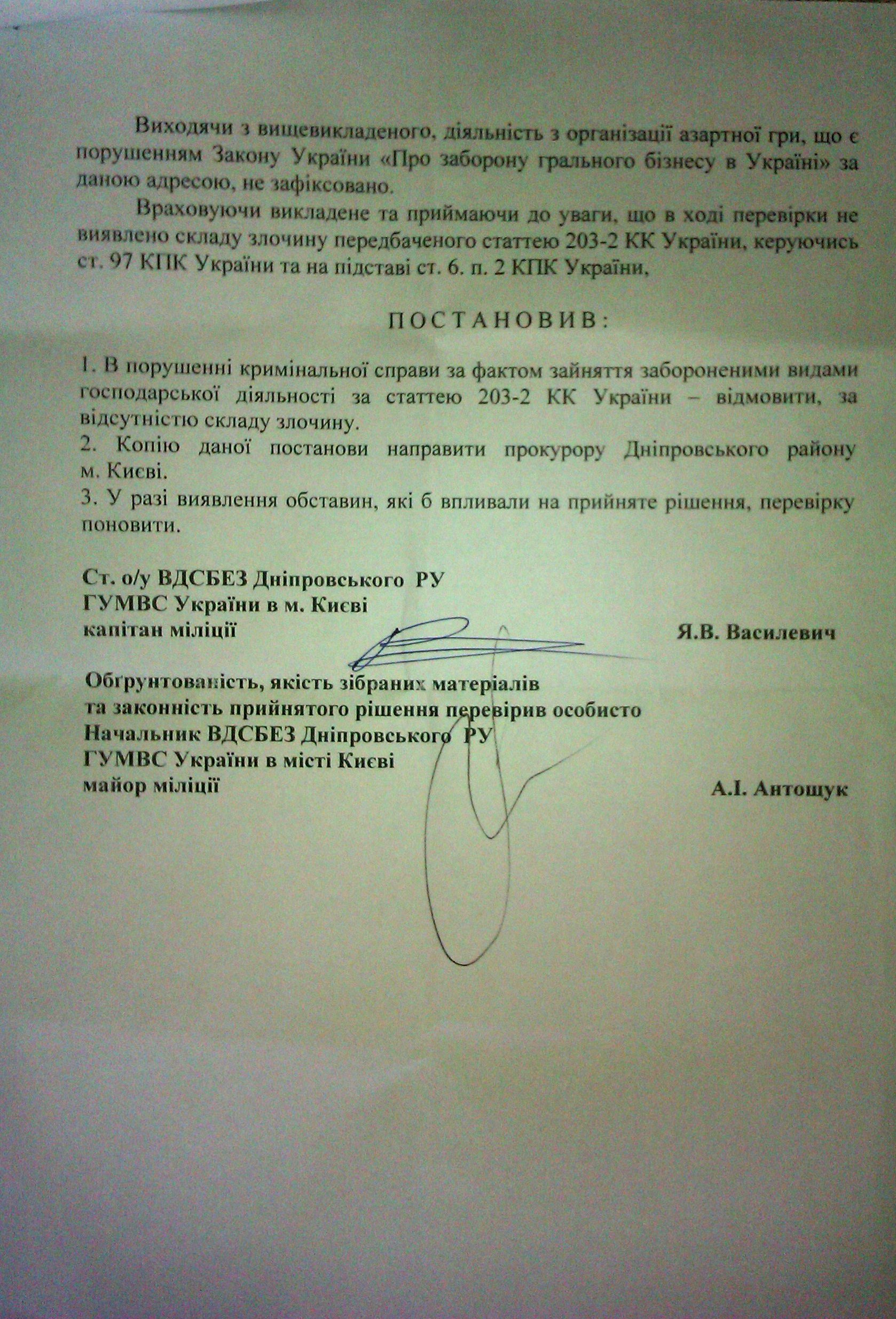 Собрав всю информацию, мы написали заявление в Днепровское районное управление милиции города Киева о нарушении законодательства по части проведения виртуальных казино. Там нас сначала внимательно выслушали, а фото и видео взять отказались, мол, их к «делу» не привяжешь… Прошло 10 дней, и мы получили постановление… об отказе в возбуждении уголовного дела. В постановлении сказано, что по указанному нами адресу работники Днепровского РУ милиции (этим занимается отдел по борьбе с экономической преступностью – УБЭП) выезжали целых два раза. И все то, что увидел журналист, они «не зафиксировали». Удивительно…