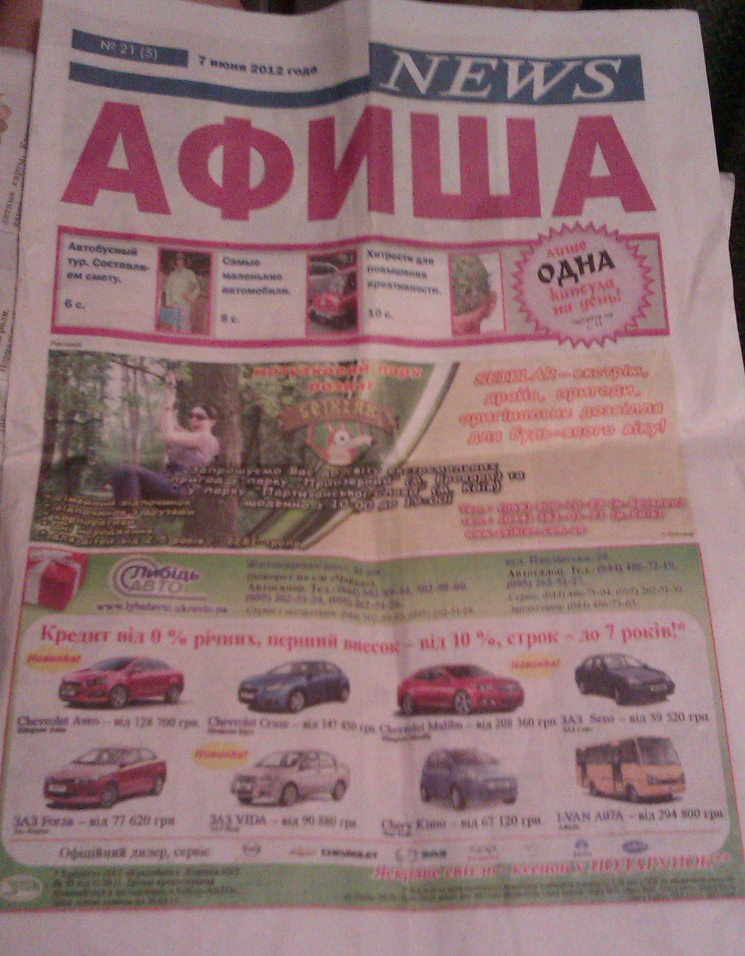 Газета «Афиша News» распространяется в киевском метрополитене. На ее страницах есть информация о грядущих культурных событиях в столице, а также анкедоты и небольшие статьи, что и заставляет людей не выбрасывать ее без предварительного прочтения. Удивительно, что реклама ясновидящих и «спасительниц» осталась без внимания правоохранительных органов, которые постоянно дежурят на станциях метро.
