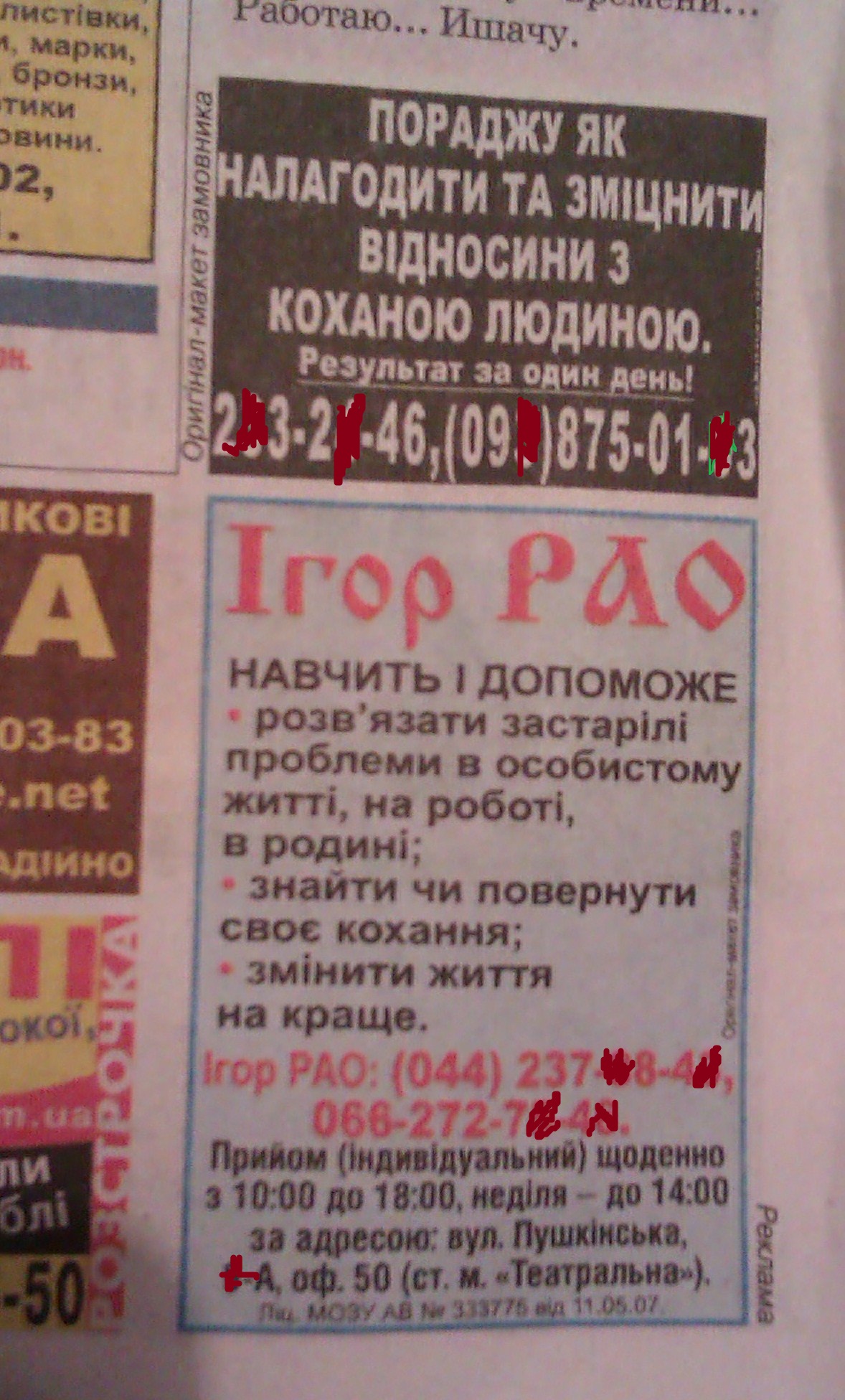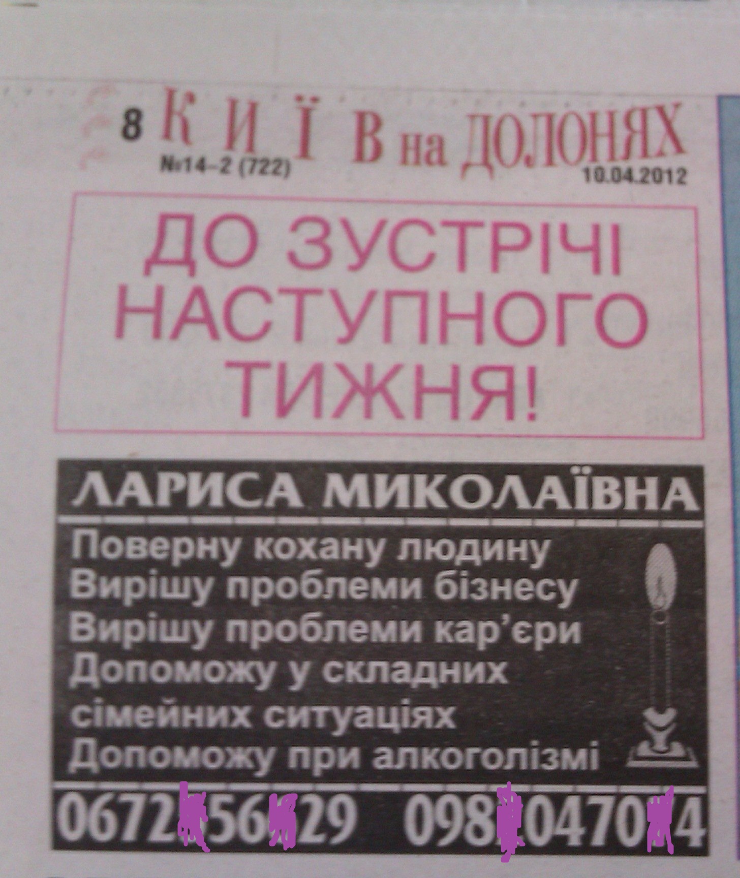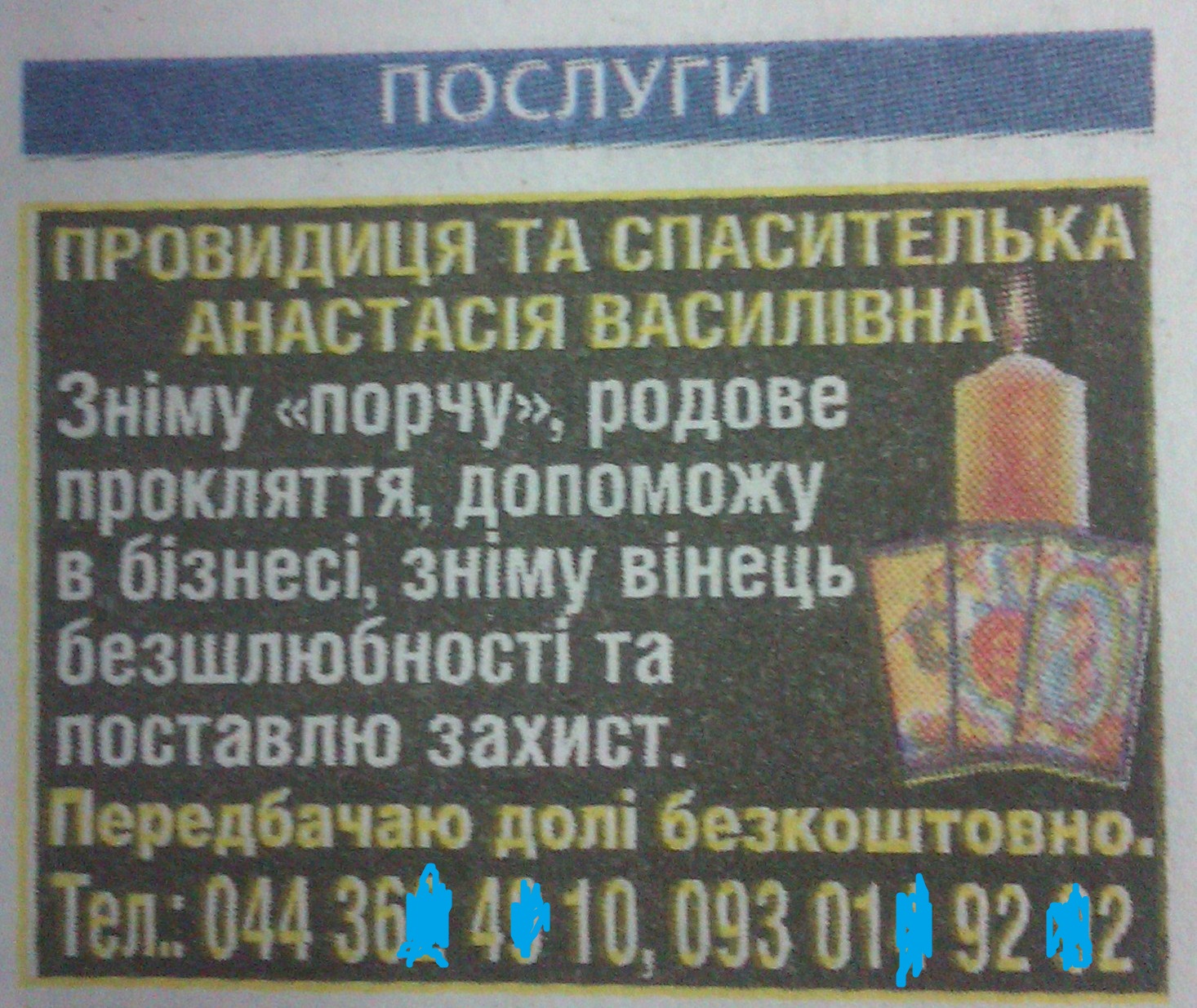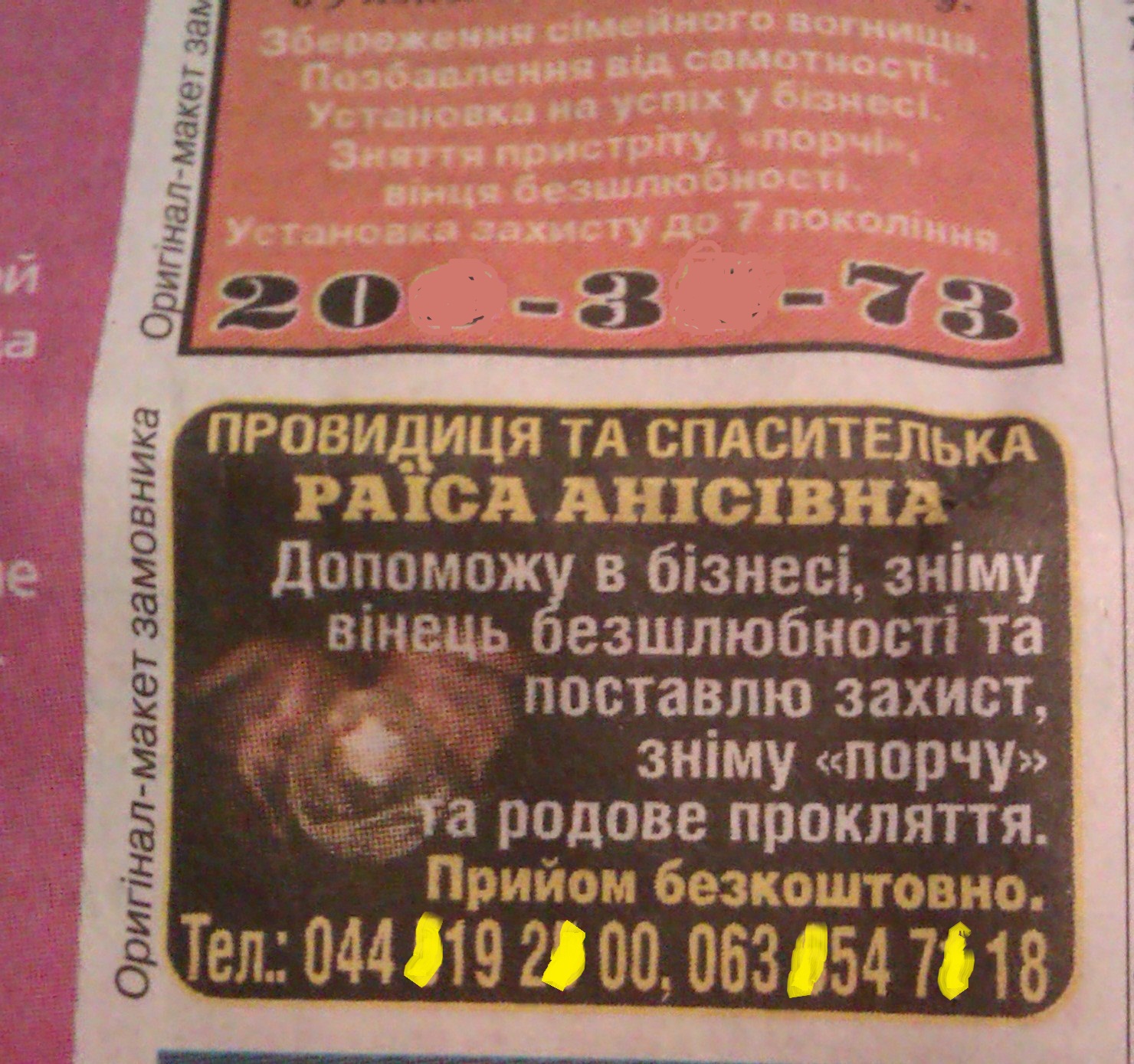 В «Киеве на ладонях» такие объявления зачастую встречаются в разделе «Услуги». Действительно, услуги здесь на любой вкус: внимательный читатель находит информацию о том, как наследственная предсказательница ставит защиту от всех уровней сглаза, ясновидящая и «спасительница» снимет порчу и родовое проклятие, и как «высококлассный профессионал, владеющий неисчерпаемой силой и энергией, найдет выход из любой (!) ситуации». А некоторые прорицатели скромно не называют свое имя, сэкономив рекламную прощадь на заглавную фразу большими буквами «ПРИВОРОЖУ!!!».