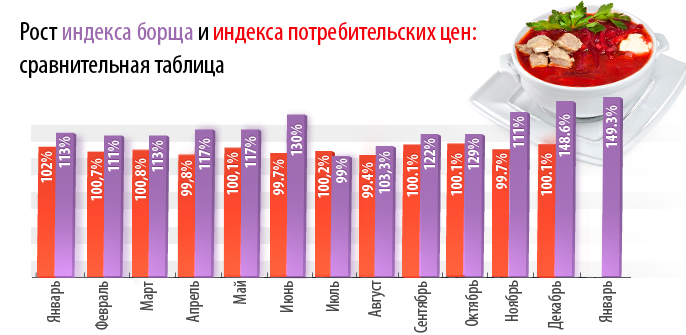 Отследить подорожания основных продуктов помогает подсчет «индекса борща», ввести который журналисты Издательской Группы «Наш Продукт» предложили еще в 2010 году. Анализируя рост цен за несколько лет, стоит отметить, что в этом году продукты дорожали не «по системе». Так, в прошлом году цены выросли немного в декабре и в январе, а этой зимой индекс борща значительно «вырос» в декабре, а вот в январе, к удивлению, остался стабилен. В прошлом месяце за тарелочку* «национальной гордости» украинцев нужно было заплатить 13,8 грн., а в январе эта сумма изменилась всего на 0,7%, теперь тарелка борща обойдется семейному бюджету в 13,9 грн.