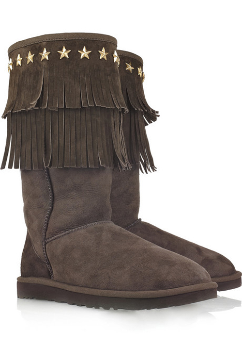 На улицах города модницы, обутые в «валенки» Ugg будут встречаться вам на каждом шагу. Практически на каждой – копия, а не фирменный экземпляр. Выглядит популярная модель так: замшевый «верх», внутри – натуральная неокрашенная овчина. Стоимость: 1500-2000 грн, цена может быть и выше, если речь идет о коллекции, созданной в сотрудничестве с еще одним известным брендом (Jimmy Choo, например).