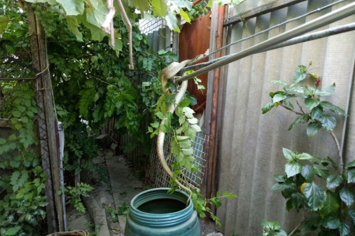 В понедельник, 22 июля, в Днепре на территорию частного домовладения заползла змея. Крупное 1,5-метровое пресмыкающиеся удобно устроилось на дереве и не на шутку испугало жильцов дома, сообщает ГСЧС в Днепропетровской области.