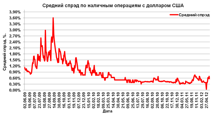 Средний спрэд по наличным операциям с долларом США за прошедшую неделю сократился на 0,02% до уровня 0,56%, что говорит о некотором снижении спроса на валюту в Украине и стабилизации ситуации на наличном валютном рынке, сообщили аналитики FOREX CLUB.