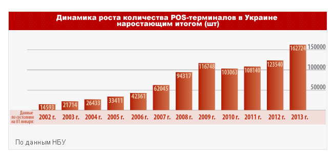Вступивший в силу закон от 18 октября 2012 года о платежных системах как раз стимулирует граждан и торговые сети к использованию безналичных платежей. Благо, в Украине растет сеть POS-терминалов (устройств для оплаты с помощью платежных карт). Пока на периферии их количество незначительно, по сравнению с индустриальными центрами. Но динамика роста сети POS-терминалов позволяет сделать вывод, что в обозримом будущем данная проблема и вовсе исчезнет: увеличение за 2012 г. – с 123540 тыс. до 162724 тыс. шт. (см. ниже график «Динамика роста количества POS-терминалов в Украине нарастающим итогом»).