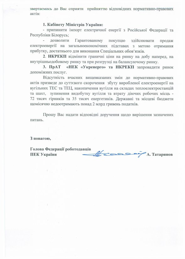 Автори звернення також повідомляють, що з початку року, залишки енергетичного вугілля на складах збагачувальних фабрик та державних шахт зросли майже у три рази і на сьогодні складають 206 тисяч тон, а теплоелектростанції відмовляються закуповувати українське вугілля. Окрім того, спровоковане зростанням імпорту російського струму падіння цін на ринку "на добу наперед" робить виробництво електроенергії на ТЕЦ і ТЕС збитковим.