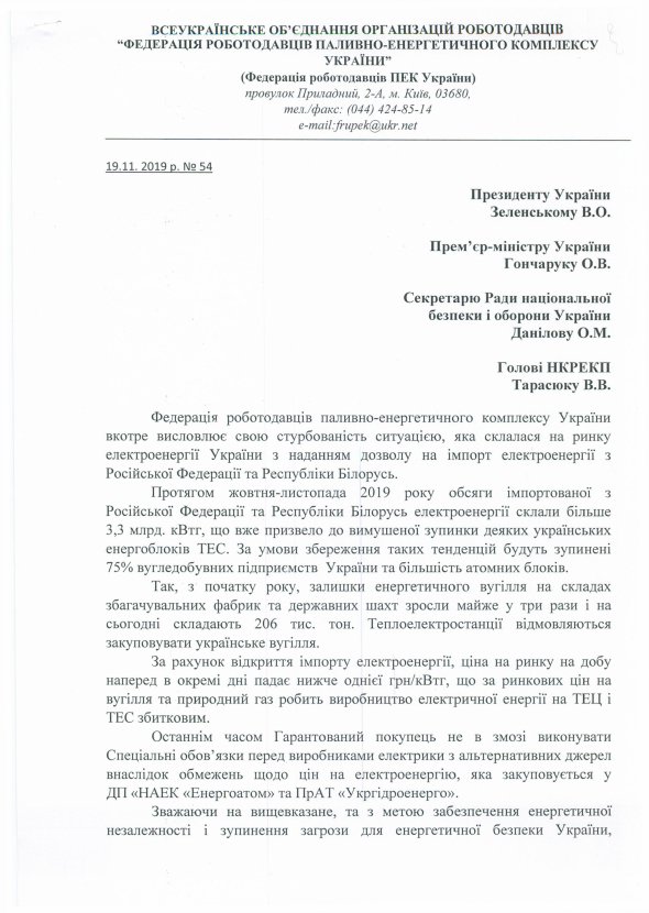 "Протягом жовтня-листопада 2019 року обсяги імпортованої з Російської Федерації та Республіки Білорусь електроенергії склали більше 3,3 млрд. кВтг, що вже призвело до вимушеної зупинки деяких українських енергоблоків ТЕС. За умови збереження таких тенденцій, будуть зупинені 75% вугледобувних підприємств України та більшість атомних блоків", - зазначається в зверненні.