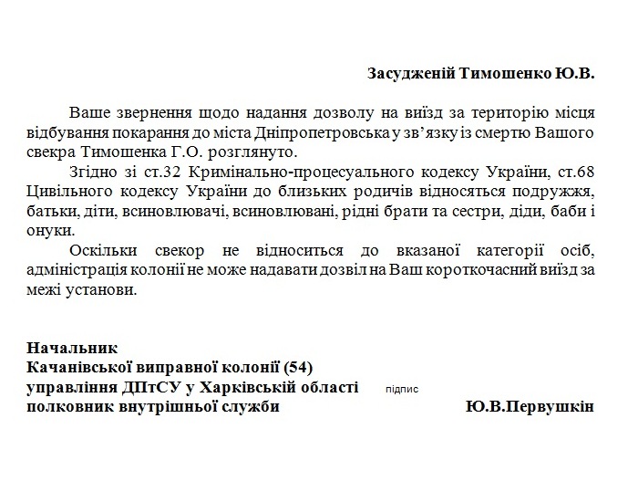 «Хозяин» Качановской колонии объяснил, почему не пустил Тимошенко на похороны (ДОКУМЕНТ)
