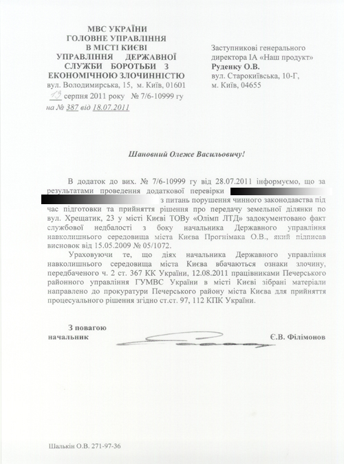 В официальном ответе Управления государственной службы борьбы с экономическими преступлениями на информационный запрос наших коллег говорится, что «задокументирован факт служебной халатности со стороны начальника Государственного управления охраны окружающей среды г.Киев Прогнимака А.В.». Данный чиновник подписал вывод от 15.05.2009 года № 05/1072, благодаря чему фирма ООО «Олимп ЛТД», принадлежащая семейству вороватого дерегулятора Бродского, получила разрешение Киевсовета на пользование земельным участком на ул. Крещатик, 23 с правом последующего выкупа. Собранные правоохранителями материалы переданы в прокуратуру города Киева для принятия процессуального решения, поскольку в действиях столичного чиновника усматриваются признаки преступления, предусмотренного частью 2 ст. 367 УК Украины – служебная халатность, повлекшая тяжкие последствия. (см. документ)