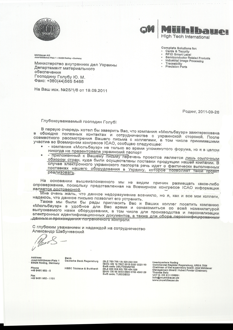Получается, что «Мюльбауэр» элементарно врет даже авторитетным изданиям, когда речь идет о многомиллионных контрактах с коррупционной составляющей? Весь черт, как говорится, в деталях. Письмо, на которое ссылается Der Spiegel, действительно было отправлено в МВД Украины после того, как в сентябре 2011 г. на симпозиуме Международной организации гражданской авиации (ICAO) в Монреале (Канада) разразился скандал. Фирма «Мюльбауэр» в презентационном листе, раздаваемом на мероприятии, в перечне проектов по внедрению электронных паспортов в качестве одного из клиентов указала Украину.