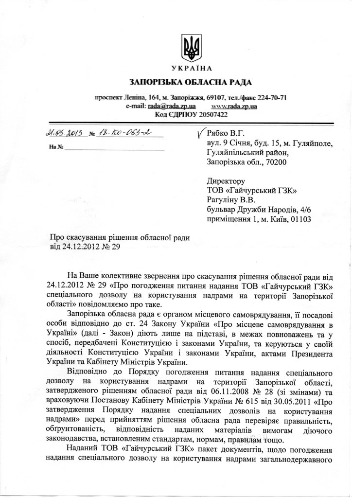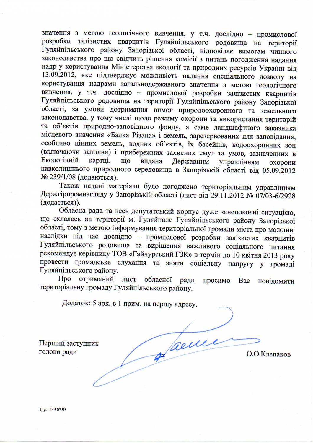 Предоставленное разрешение на пользование недрами общегосударственного значения с целью геологического изучения, а также научно-исследовательской разработки железистых кварцитов Гуляйпольского района Запорожской области соответствует требованиям действующего законодательства, о чем свидетельствуют решения комиссии по вопросам согласования предоставления недр в пользования Министерства экологии и природных ресурсов Украины от 13.09.2012, которое подтверждает возможность предоставления специального разрешения на пользование недрами общегосударственного значения с целью геологического изучения», - значится в ответе Запорожского облсовета на обращение гуляйпольцев.