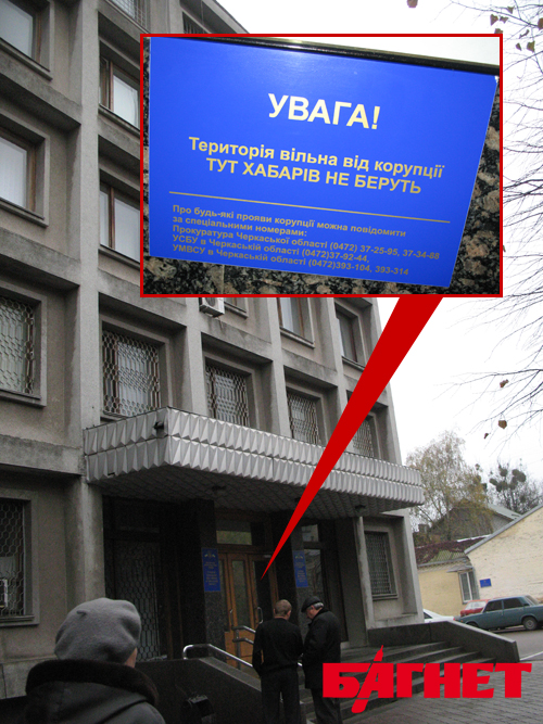В здании Черкасского областного управления милиции красуется табличка "Территория свободная от коррупции", что не мешает Швачко и его местечковым партнерам открывать фирмы- присоски, оббирающие людей чуть ли не по каждому адресу, где работают подразделения МВД в Черкассах.
