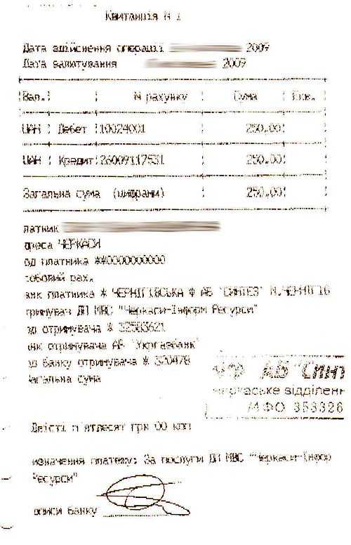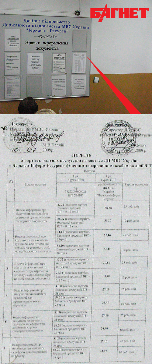 Помимо платежей за оформление справки о несудимости, ДП ГП МВД Украины "Черкассы- Информ- Ресурсы" взимает со всех граждан, обратившихся за срочным оформлением загранпаспорта еще 250 грн., с расплывчатой формулировкой назначения платежа "...за услуги". Очевидно, именно "Черкассы- Информ- Ресурсы" является получателем денег и правопреемником ГП "Ресурсы- Документ", под вывеской которого и работает упомянутая в статье Наталья Дегтяренко.