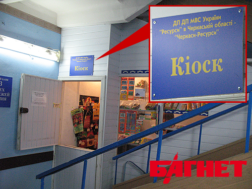 В Черкассах, как мы уже упоминали, есть «великий бизнесмен» Александр Маяк, частные фирмы которого, как следует из справок Госкомстата, специализируются на строительстве, транспортных услугах и торговле. И вот вам пожалуйста – очевидно, исходя из специализации «нужного» человека, под Александра Маяка зарегистрированы государственные «ДП ГП «Черкассы- Ресурсы», «Черкассы- Информ- Ресурсы», «Черкассы- Ресурсы- Авто- Информ», «Черкассы- Ресурсы- Авто» и т.д. Вы будете смеяться, но, например, «ДП ГП «Черкассы- Ресурсы», помимо оформления справок о несудимости, занимается еще и торговлей жевачками, шоколадками и прочей «легкой» снедью, прямо в помещениях ГИРФЛ (см. фото ниже)!!! А чего выпускать деньги – пусть и шоколадки покупают в «правильных» милицейских фирмах, коль пришли за загранпаспортами?!