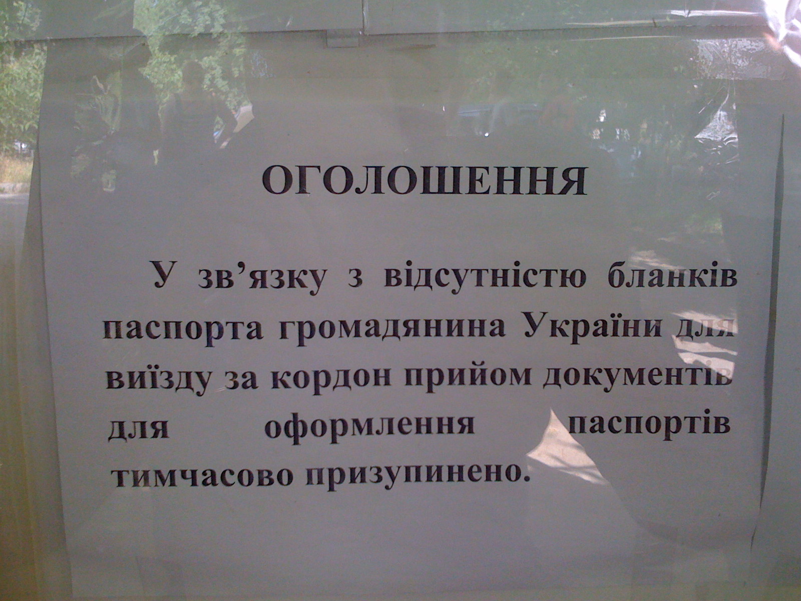 И первое, что увидели журналисты на стенде – это огромное объявление «У зв’язку з відсутністю паспорта громадянина України для виїзду за кордон, прийом документів для оформлення паспортів тимчасово призупинено».