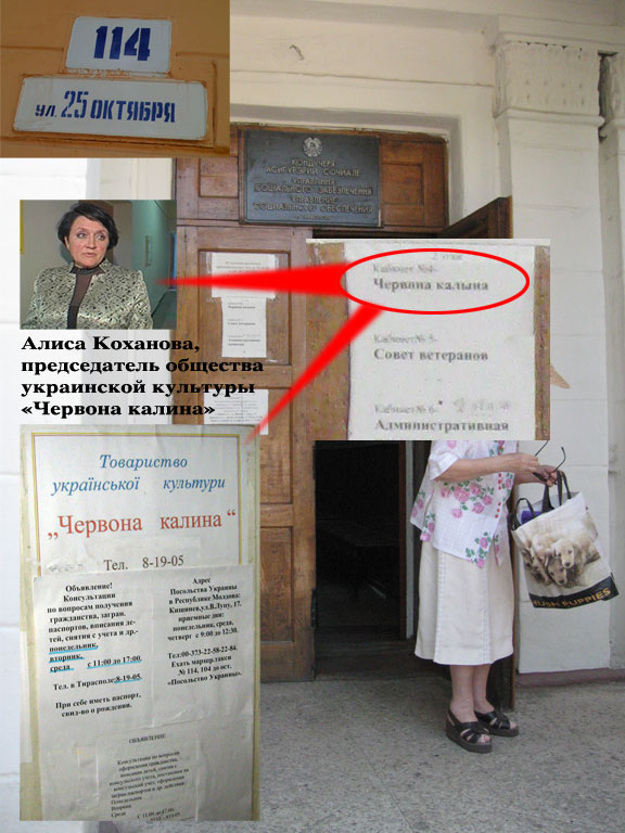 В ходе пресс-конференции журналисты-расследователи поделились своими впечатлениями от посещения «Червоно калины». Формально -- это общественная организация, центр украинской культуры. Но сразу бросаются в глаза две особенности. Во-первых, центр украинской культуры почему-то находится в административном здании ПМР, на территории отдела социального обеспечения. И, что самое интересное, кабинет госпожи Кохановой находится буквально по соседству с кабинетом приднестровского омбудсмена Василия Калько. Они сидят фактически через стенку. Видимо, от столь тесного соседства молдавский омбудсмен постоянно пишет письма о том, что нарушаются права граждан Украины, проживающих в Приднестровье. Кстати, «Багнет» уже сообщал об этой внезапной активности омбудсмена Калько.
