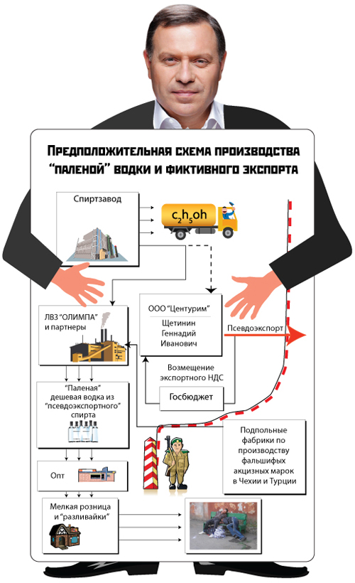 В 2009 году ГНАУ устроила целый «разбор полетов» по результатам комплексной проверки налоговой службы в Донецкой области. Был там и неучтенный спирт, и фальшивые акцизные марки. Как вы думаете, могли ли предприятия Климца не поучаствовать в таком заманчивом деле? Ответ, думается, очевиден. Схема – тоже. Например, с одного из спиртзаводов в Тернопольской области контрактуется спирт якобы для экспорта в Турцию. Контрагент спиртзавода – некая американская фирма «Центурим». По документам спирт якобы едет в Турцию, а на самом деле – на ликеро-водочные заводы «Олимпа». А экспортер еще и возмещает себе экспортный НДС. Поговаривают, что за подобые схемы у Климца отвечал некто Геннадий Щетинин.