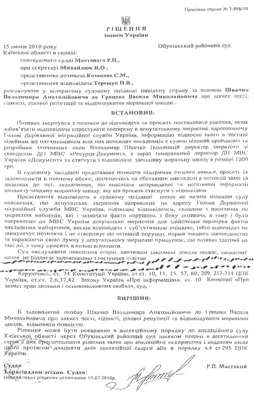 Как стало известно «Багнету», Апелляционный суд Киевской области отказал в удовлетворении апелляционной жалобы Швачко В.А. на решение Обуховского районного суда Киевской области от 16.07.2010 года, которым было полностью отказано в иске Швачко В.А. к народному депутату Грицаку В.Н. о защите чести, достоинства, деловой репутации, возмещении морального ущерба.