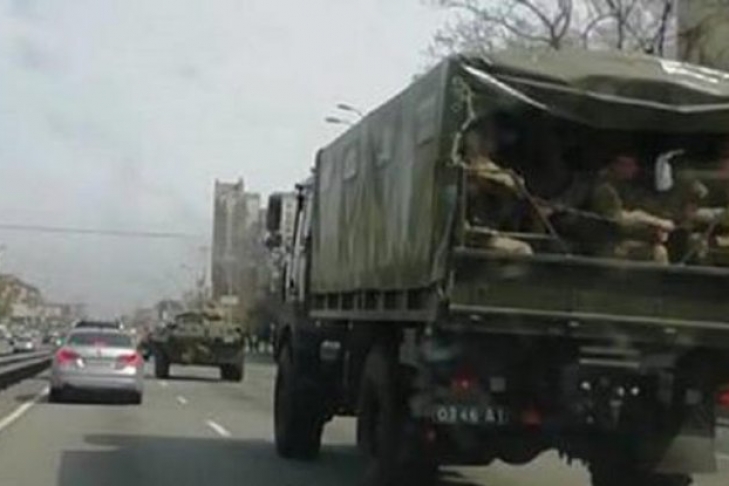 Он также опубликовал видео, на котором видно, как по столичной улице едут БТРы, военные грузовики с солдатами и полевые кухни.