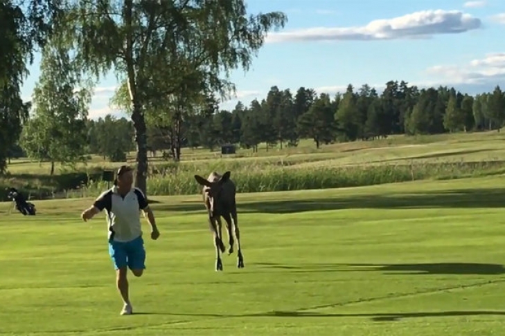 Молодой лось пришел на поле для гольфа в Швеции и попытался сыграть в догонялки с одним из игроков.