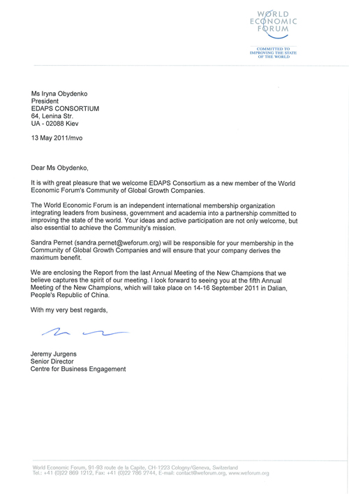 И самым последним подтверждением наших мировых глобальных достижений стало присвоение директоратом World Economic Forum консорциуму «ЕДАПС» статуса «Глобально Развивающейся Компании» (Global Growth Company).