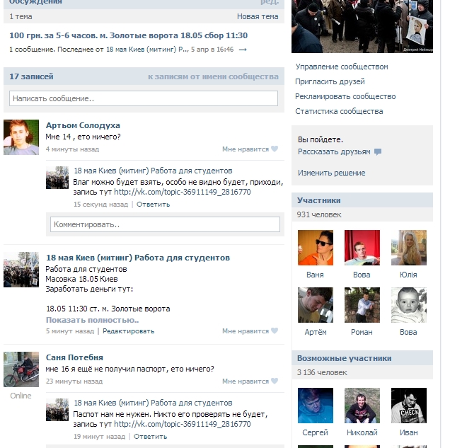 «18.05, 11:30, метро «Университет», оплата 25 гривен/час, стоим 4 часа, итого – 100 гривен. Дополнительно платим: держать флаг + 25 гривен, каждый человек от вас 30 гривен. Внимание, много кидал! Стоим за БЮТ! Кидков не будет!», - говорится в записи одного из пользователей сети ВКонтакте. Кроме метро «Университет», согласно записям, сбор массовки будет производиться возле метро «Золотые ворота», метро «Арсенальная», возле Европейской площади, а также Арки Дружбы Народов. В свою очередь, пользователь Фейсбук Костя Яблунец отмечает, что мероприятие актуально для «людей фейсбука, лидеров мнений, тех, у кого много друзей».