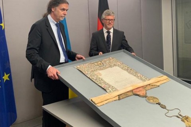Германия вернула Украине грамоту Петра I о поставлении митрополита Иосафата (Кроковского) на Киевскую митрополию, которая была вывезена из Киева во время Второй мировой войны.