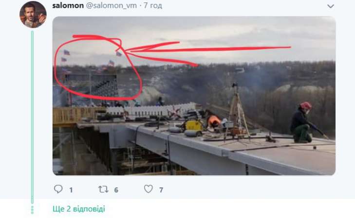 На фотографии виден мост в Станице Луганской, который сейчас ремонтируют. Однако на заднем плане развиваются флаги боевиков так называемой ЛНР.