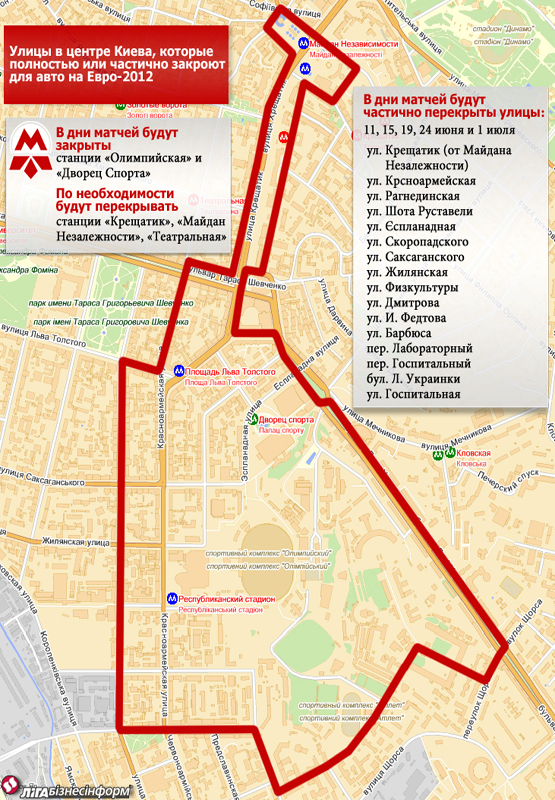 Кроме того, в дни матчей (11, 15, 19, 24 июня и 1 июля) для создания пешеходных маршрутов дополнительно ограничат движение транспорта еще на ряде улиц в районе НСК "Олимпийский". В частности, ограничения коснутся улиц Анри Барбюса (от ул. И.Федорова до Димитрова), Красноармейской (участок от ул.И.Федорова до бульвара Т.Шевченко), И.Федорова (от ул.Красноармейской до Предславинской), Димитрова (от ул.Красноармейской до Анри Барбюса), Физкультуры (от ул.Горького до стадиона "Олимпийский"), Жилянской (от ул.Горького до Ш.Руставели), Саксаганского (от ул.Горького до Эспланадной), Ш.Руставели, Эспланадной, Рогнединской, Скоропадского, Госпитальной, переулка Лабораторного (от ул.Летней до здания Федерации футбола Украины), Бессарабской площади, бульвара Л.Украинки (от ул.Госпитальной до пер.Щорса), переулка Госпитального.
