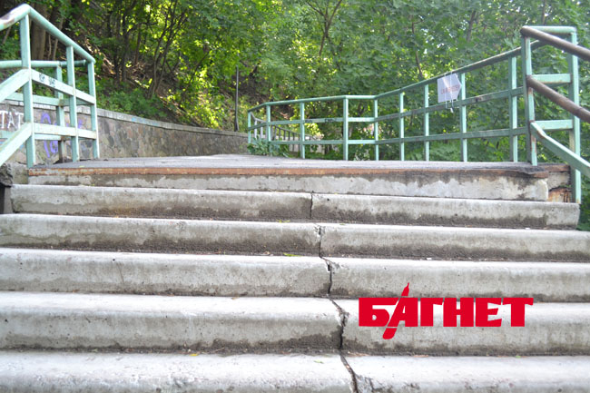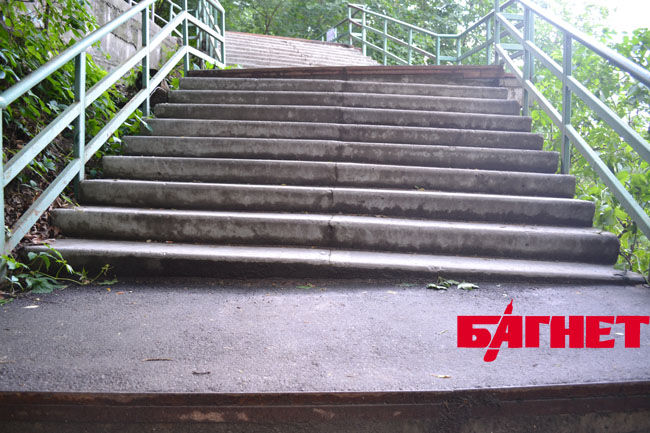 Лестница к мосту с вышеописанной «аллеи» - отдельная песня, но тоже, увы, грустная. Внимательно присмотревшись к лестнице на фото, читатели могут с легкостью отметить, что она, несмотря на то, что сделана совсем недавно, уже успела «просесть».