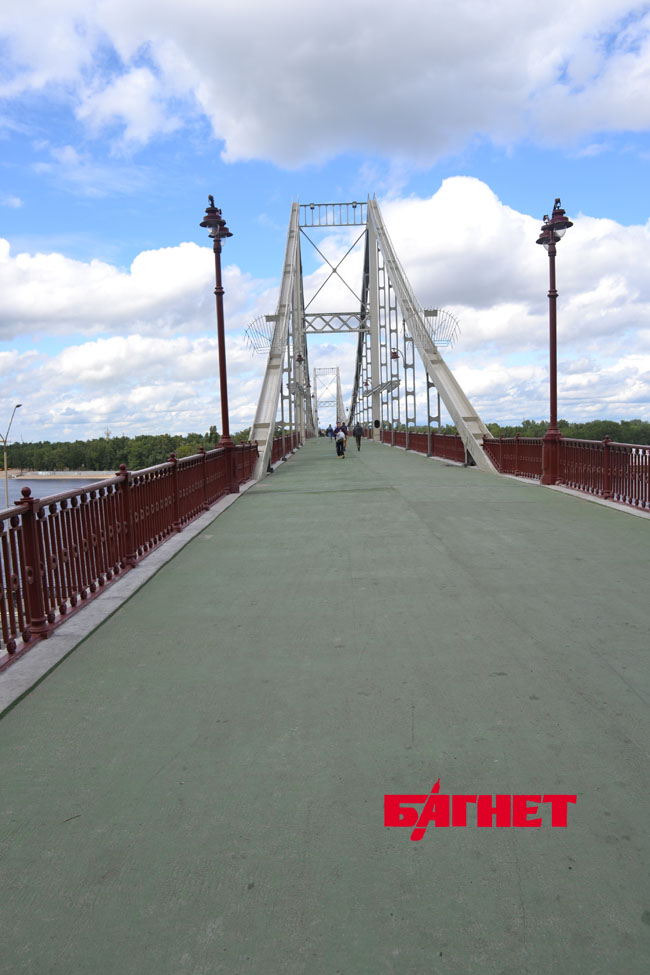 После лестницы, которая выводит нас к Пешеходному мосту (покрытому непонятно зачем слоем зеленого покрытия, что создает специфическое впечатление, особенно на фоне синевы Днепра)....