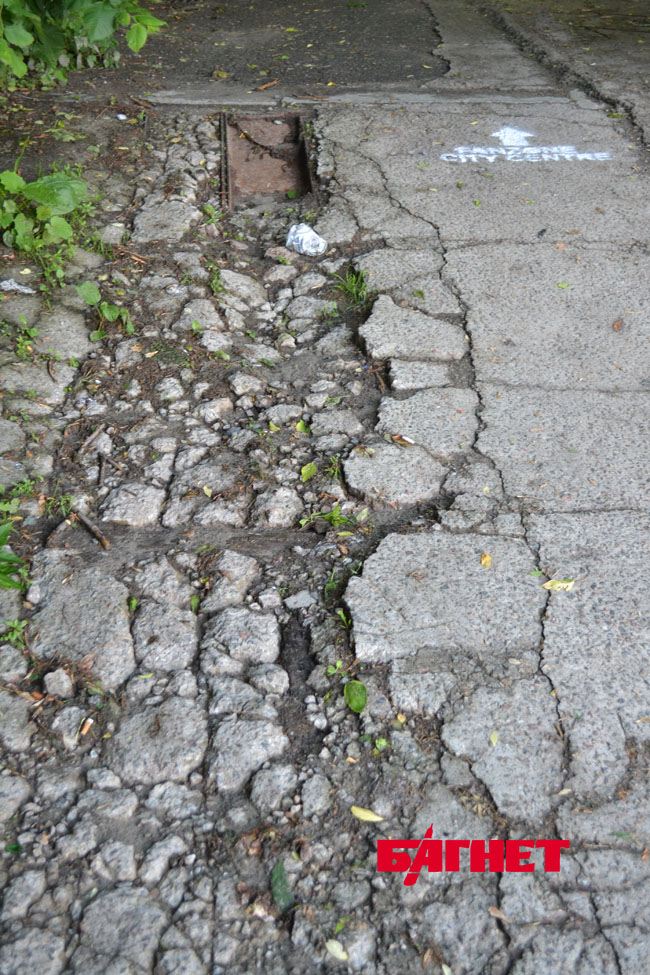 ...или же просто ямы и неровности в бетонном покрытии «аллеи». Как не споткнутся на таком покрытии, да еще и в темноте (никаких фонарей и приборов освещения, как могут увидеть по фото читатели нет), да еще и «под мухой» после очередного матча, непонятно... Берегите ноги, дорогие гости. Уедете целыми и невредимыми из нашей страны - радуйтесь.