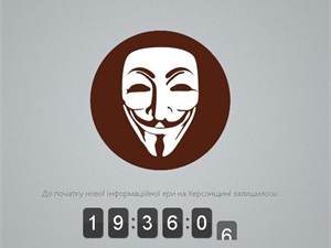 Какие сайты уже сломаны, он пока не сообщает. Но в подтверждение этих угроз вчера был взломан сайт Херсонской обладминистрации. На главной странице этого сайта появились маска Гая Фокса из фильма «V значит Вендетта».Также там появилась фраза «До начала новой информационной эры на Херсонщине осталось ...» и счетчик.