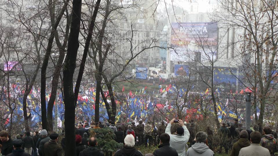 В 12 часов возле монумента Кобзарю стали собираться поклонники европейской интеграции Украины. По данным СМИ, их количество превышает 50 тыс. человек. Не обошлось без первой потасовки: народ снес на своем пути агитационную будку коммунистов около памятника Ленину.