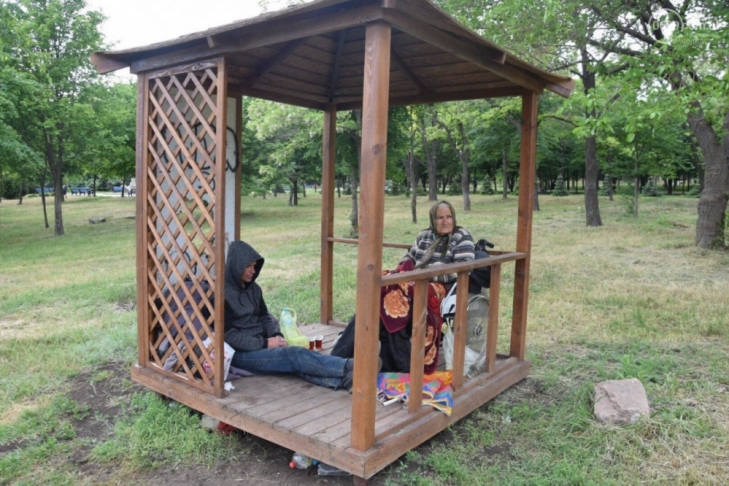 Поэтому бабушка и ее внук обустроили себе жилье в беседке. Здесь они спят на матрасах. Есть даже белье и кое-что из посуды. Все вещи принесли горожане. Они их кормят, одевают и помогают найти жилье.