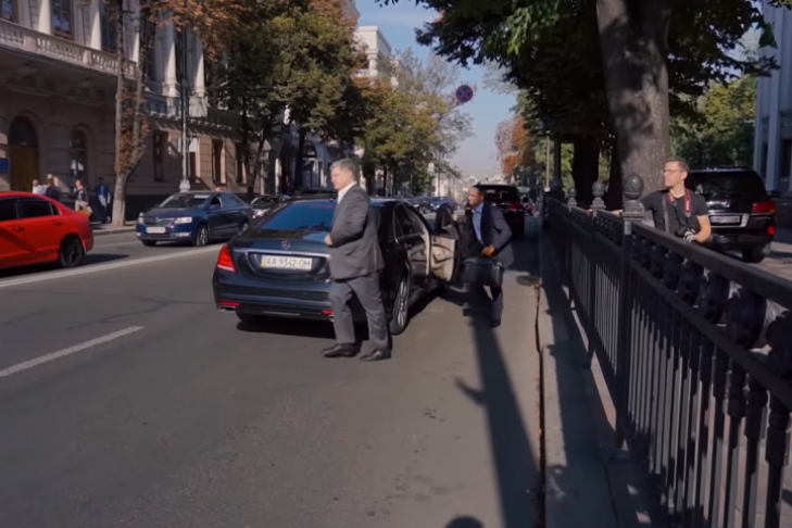 Как отмечается, украинцы засняли момент, когда автомобиль Порошенко остановился под знаком "Остановка запрещена". После этого бывший президент вышел из машины с охранником и перешел через проезжую часть на красный свет.