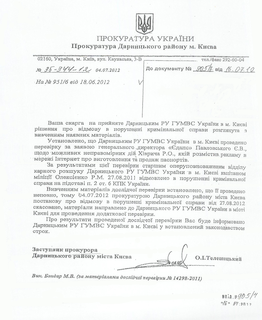 Напомним, Консорциум «ЕДАПС» продолжает защищать интеллектуальную собственность и честь государства. Ранее Дарницкое РУ ГУМВД Украины г. Киева в исполнении решения суда предоставило руководству консорциуму «ЕДАПС» информацию о мошеннике, который размещал в интернете объявления о торговле паспортами граждан Украины, используя при этом электронную почту edaps@email.ua.
