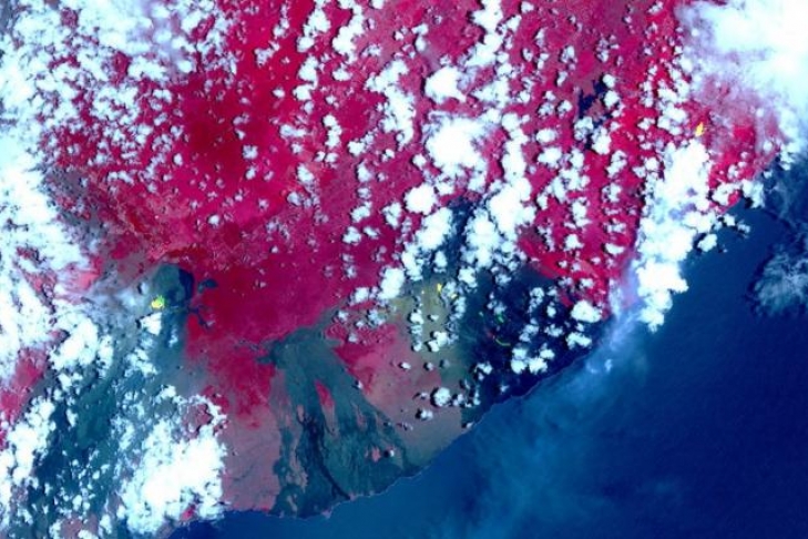 Извержение вулкана Килауэа, который является самым активным на Гавайях, повлекло ряд газовых и лавовых трещин в зоне Восточного Рифа. Это хорошо видно на фотографиях, сделанных из космоса NASA. На одном из снимков можно увидеть старые потоки лавы, которые обозначены черным и серым цветами, красные же участки обозначают растительность.