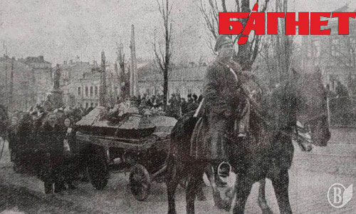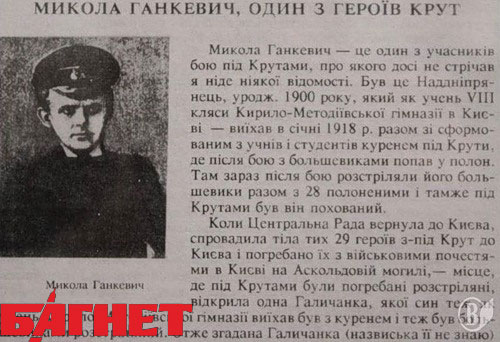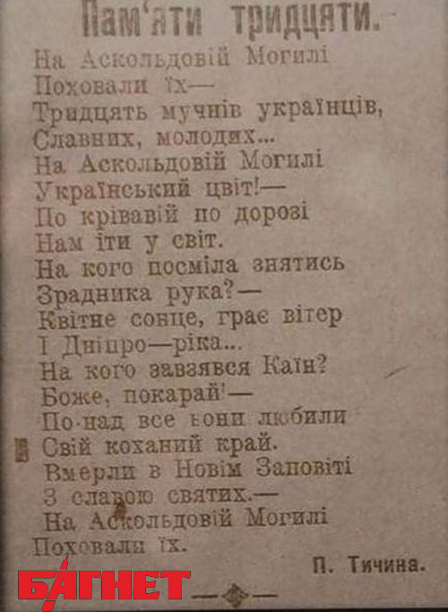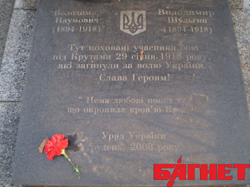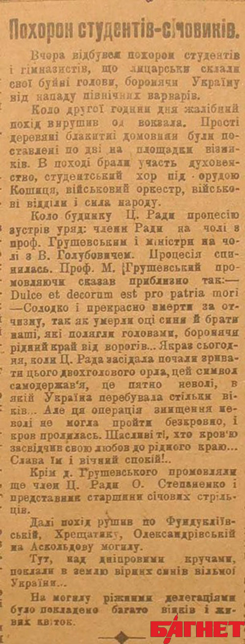 А погибшие студенты действительно были похоронены в Киеве, а точнее - перезахоронены на Аскольдовой могиле, вот только происходило это не сразу после сражения, а 18 марта 1918-го. В январе было не до того, чтобы вспомнить о героях, тем более – кому, тем, кто сбежал и бросил парнишек на произвол. Героями их сделали решения Брест-Литовского мира, когда появилась возможность искать героев украинской революции, причем в прямом смысле слова, поскольку кроме 27 киевских ребят других просто не было.