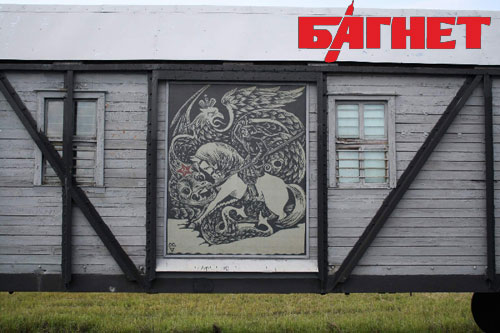 На одном из вагонов так и представлен казак решительно и смело уничтожающий большевистскую гадину и, почему-то, одноглавого имперского орла…