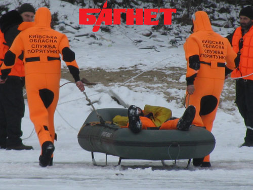 Сотрудники МЧС вчера демонстрировали, как вытаскивать из ледяной воды потерпевшего и оказывать ему первую помощь. Состоялась тренировка на Днепре возле базы спасательной службы города Лютеж Киевской области.