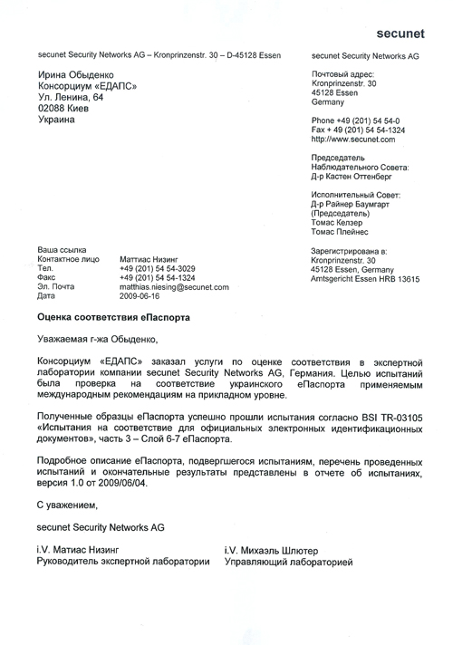 Еще в 2009-м е-паспорт (его разработали специалисты консорциума «ЕДАПС») успешно прошел экспертизу ICAO. Об этом говорится в официальном заключении экспертов лаборатории: «Мы рассмотрели отчеты о соответствии, технические оценки и результаты тестирования, представленные сертифицированными испытательными лабораториями Secunet Security Network (Германия) и FIME Europe (Франция), которые продемонстрировали положительные результаты оценки, проведенной для образца украинского электронного паспорта. ICAO приятно сообщить, что выводы лабораторий подтверждают соответствие украинского электронного паспорта сертификациям ICAO и поощряет Правительство Украины продолжить выполнение своих обязательств по выдаче новейших защищенных проездных документов гражданам Украины».
