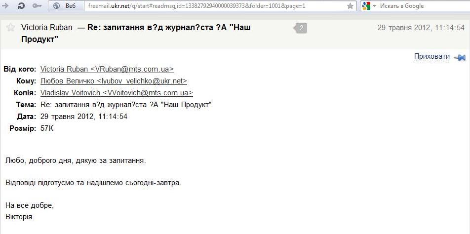 А вот в ответ на заданные нами вопросы генеральному директору «МТС» Ивану Золочевскому мы получили письмо от представителя пресс-службы компании Виктории Рубан, в котором она пообещала ответить на вопросы в течение двух дней.