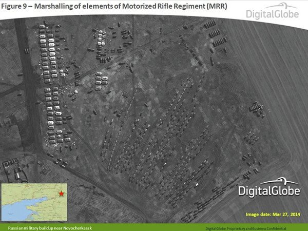 Как свидетельствуют подписи к снимкам, на них якобы изображены истребители и вертолеты на аэродроме Приморско-Ахтарска, «вероятная бригада воздушных войск или войск специального назначения» в Ельске, бронетехника в районе Кузьминки, артиллерийский батальон возле Новочеркасска и вертолеты рядом с Белгородом.