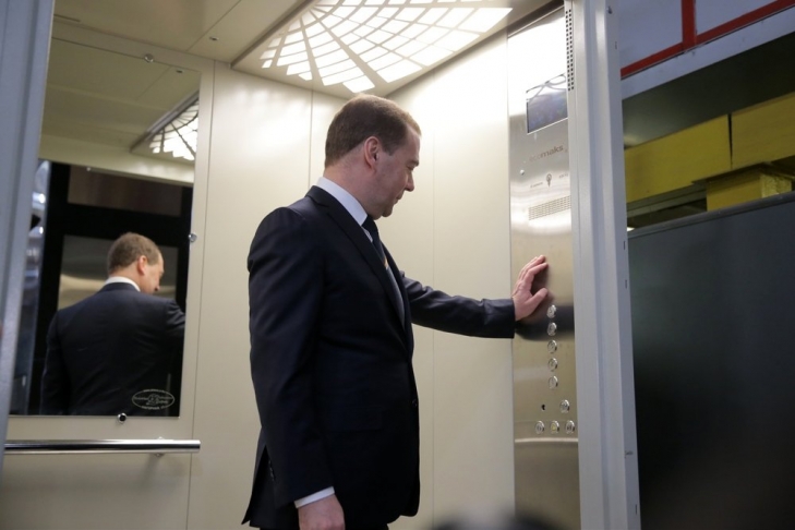 Премьер-министр Российской Федерации Дмитрий Медведев попытался осмотреть одну из кабин лифта Щербинского лифтостроительного завода, когда неожиданно двери начали закрываться.